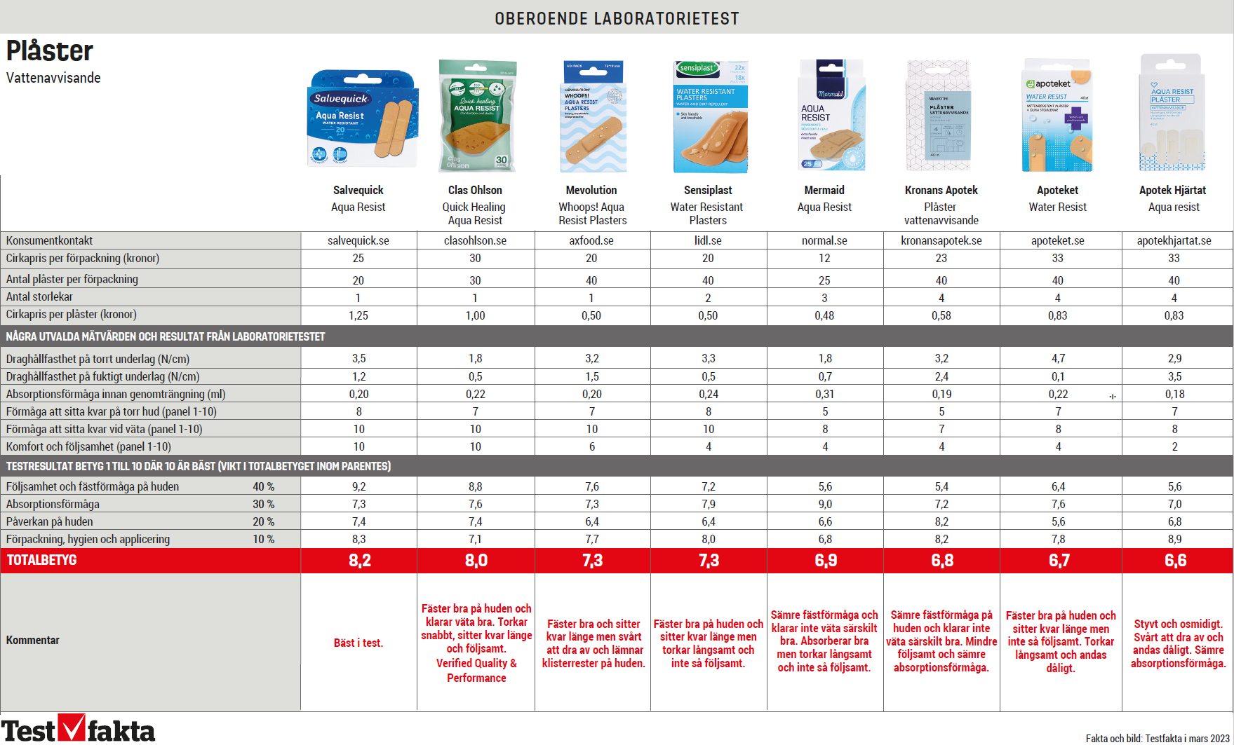 Testfakta genomförde ett test på den svenska marknaden 2023, då jämfördes åtta varumärken av vattenresistenta plåster och redan då utsågs Salvequick Aqua Resist till bäst i test. Testet nedan visar hur dessa lokala produkter presterade i det oberoende laboratorietestet. Resultatet stärktes ytterligare när det internationella testet genomfördes av 29 plåster och det visade att Aqua Resist står sig stark på den internationella marknaden.