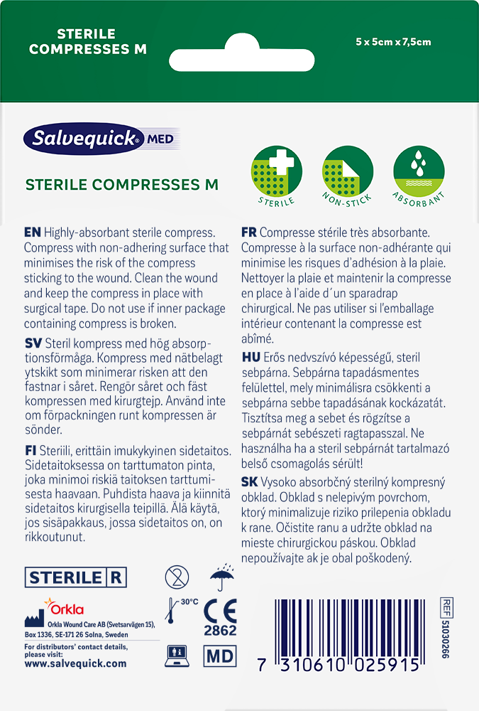 Sterile Compresses M är sterila och högabsorberande kompresser som låter huden andas. Kompresserna har en icke-vidhäftande yta som minimerar risken för att förbandet fastnar i såret. Denna förpackning innehåller fem medelstora kompresser.